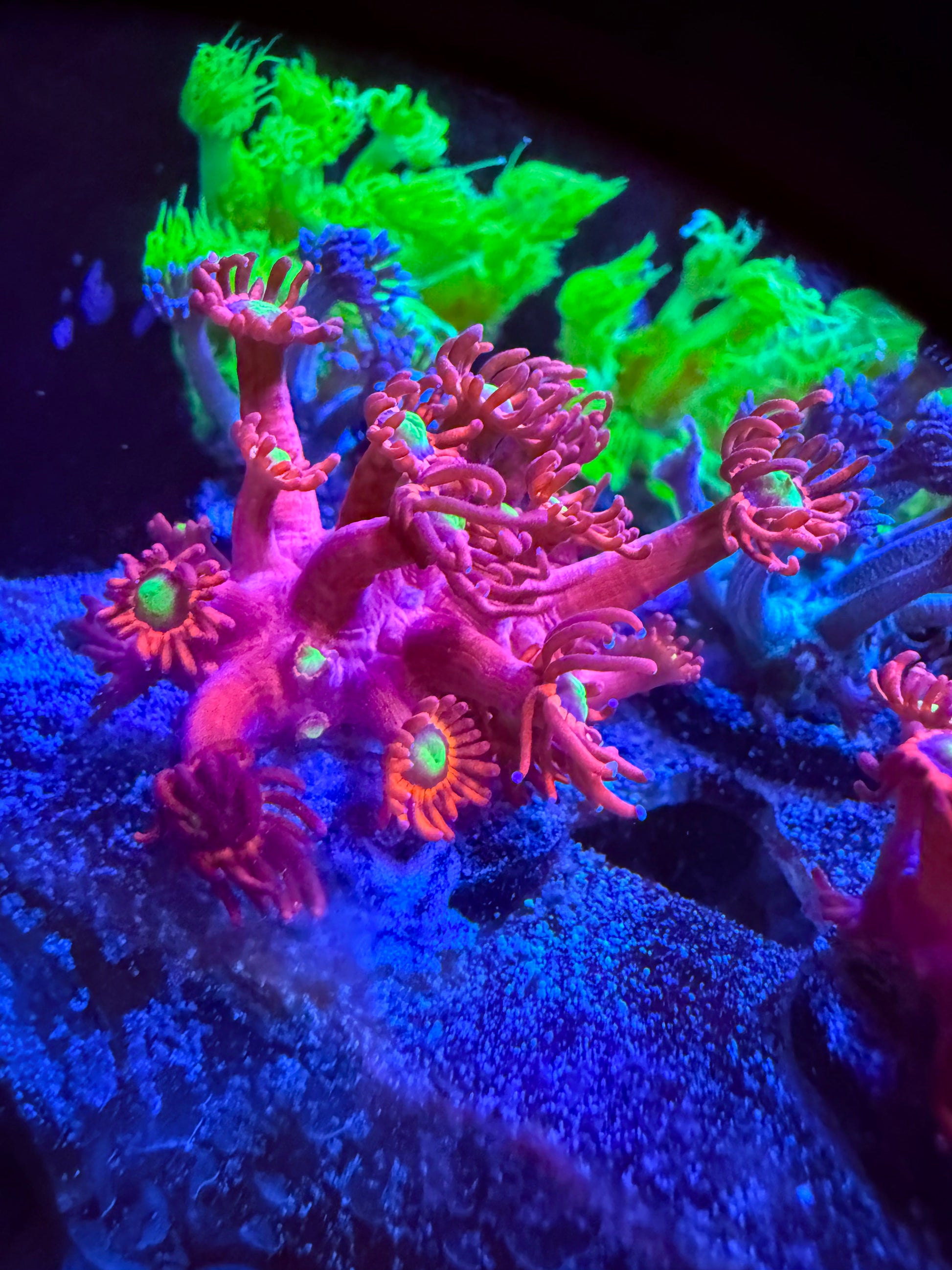 The is the LRO Candy Apple Goniopora. It’s an electric pink with neon green eyes. It’s a hardy strain and grows well. It does seem to get peek coloration at about 100 par. If you’re a Goni collector like myself you need to have this piece because it can steal the show.